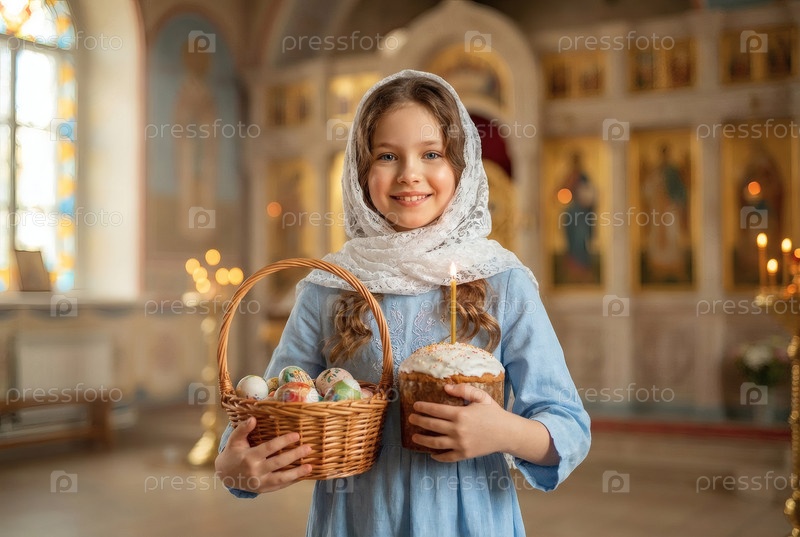 Религия и вера. Счастливой Пасхи. Портрет маленькой девочки в русском народном шарфе с плетеной корзиной пасхальных яиц и пасхального кулича внутри церкви