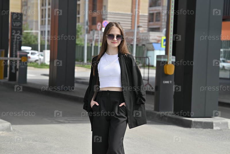 Женщина, идущая возле выдвижных ворот перед современным зданием
