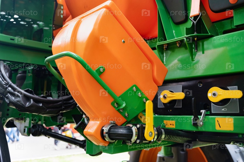 Близкий план ярко оранжевых и зеленых деталей сельскохозяйственных машин с желтыми ручками на размытом наружном фоне, подчеркивая сельскохозяйственное оборудование