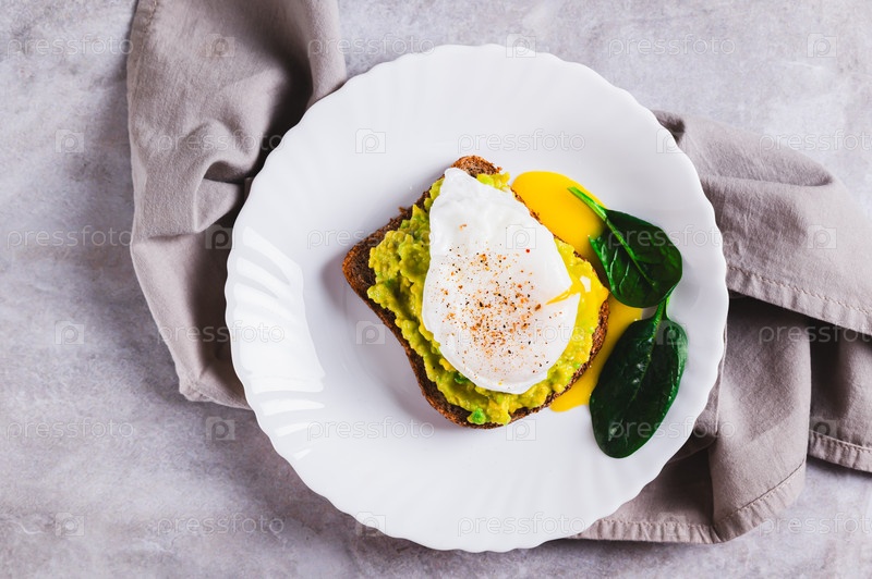 Близкий снимок ржаного хлеба с гуакамолем и яичницей на тарелке на столе
