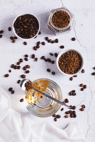 Концепция выбора между кофейными зернами и мгновенным кофе с вертикальным видом