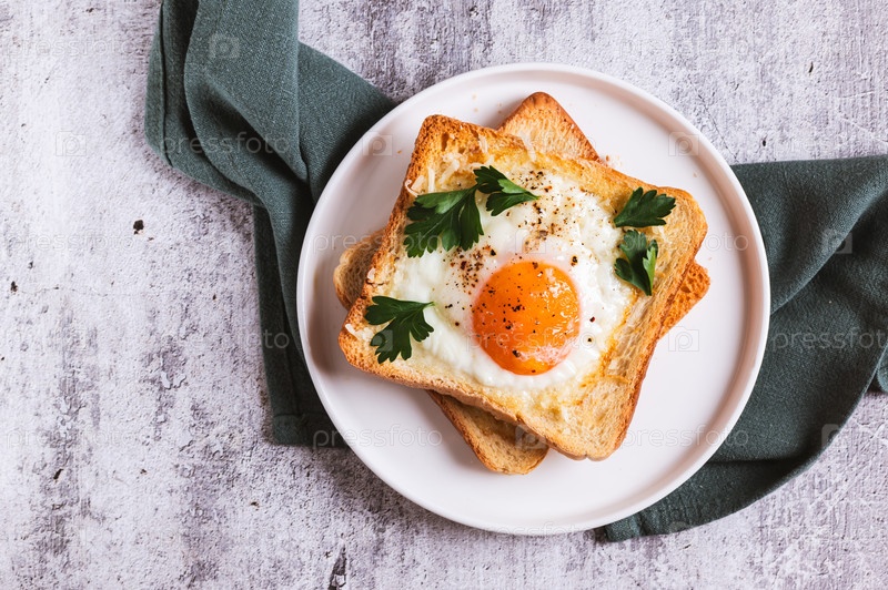 Близкий снимок яйца, выпеченного на кусочках хлеба на тарелке на столе