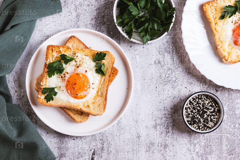 Яйцо, выпеченное в кусочках хлеба на тарелке на столе