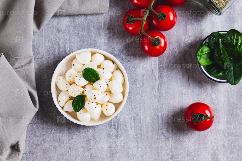 Моцарелла с сыром в маленьких шарах в миске на столе top view