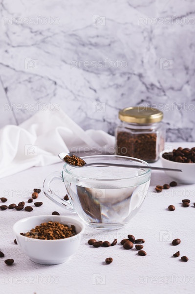 Чашка воды, гранулы мгновенного кофе и кофейные зерна на столе вертикальный вид