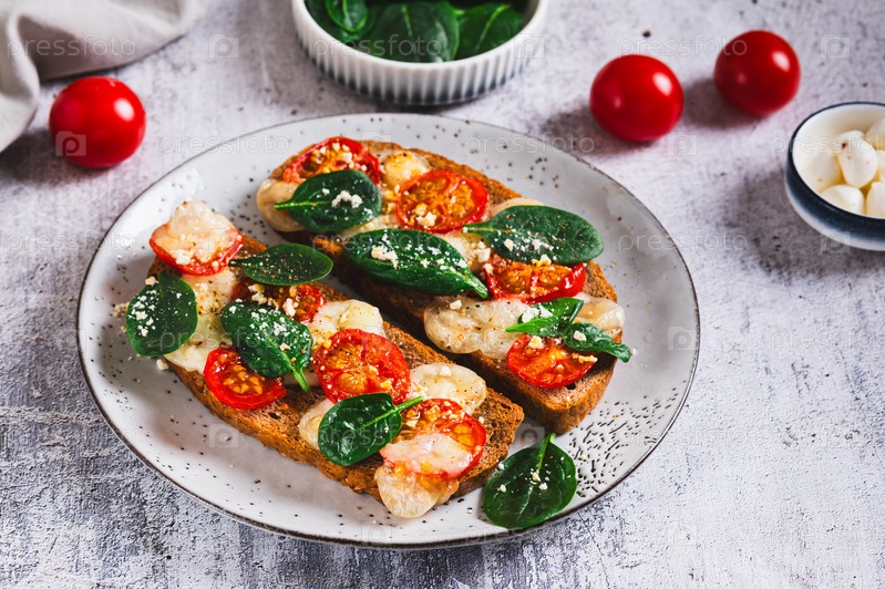 Выпеченная брушетта со салатами капрезе и шпинатом на тарелке на столе