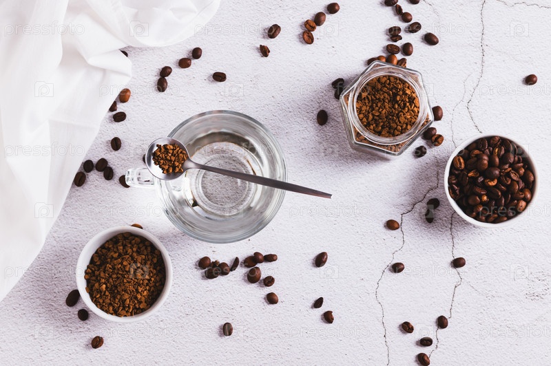 Чашка воды, гранулы мгновенного кофе и кофейные бобы на столе