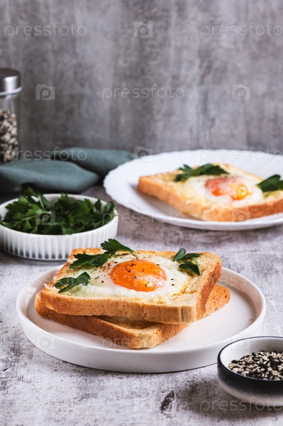 Яйцо, выпеченное в кусочках хлеба на тарелке на столе вертикальный вид