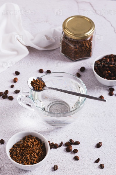 Концепция выбора между кофейными зернами и мгновенным кофе на столе вертикальный вид