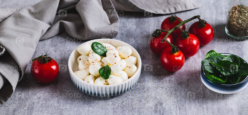 Сыр моцарелла в небольших шарах в миске на столе веб-баннер