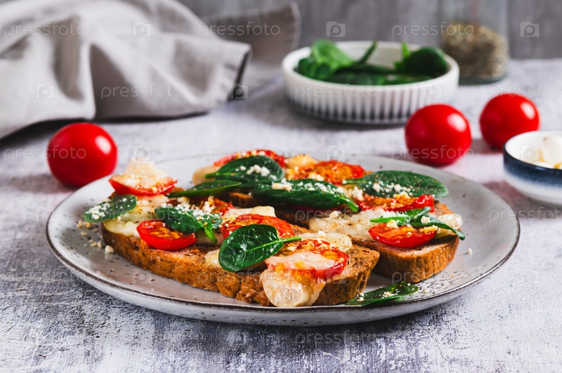 Выпеченные бутерброды с моцареллой, помидорами и шпинатом на тарелке на столе
