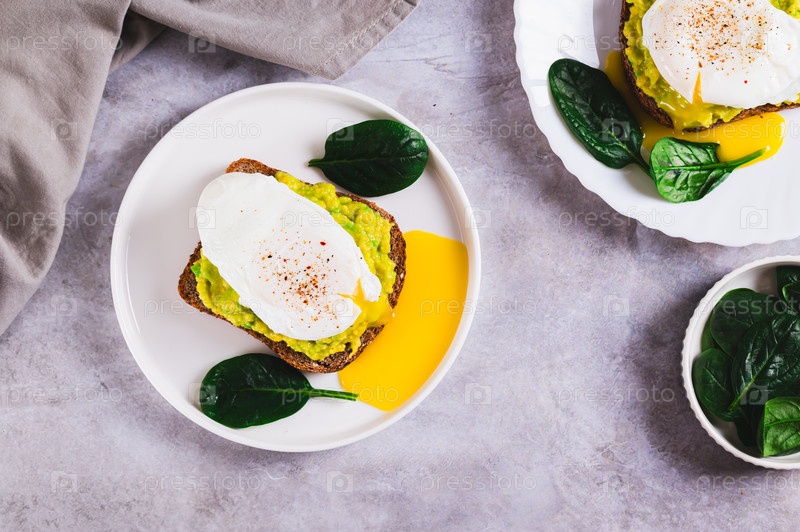 Ржаной хлеб с гуакамолем и яичницей на тарелке за столом