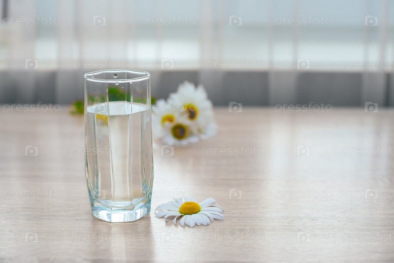 Стакан воды и ромашка на деревянном столе