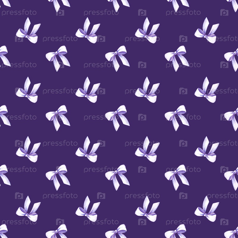 Бесшовный рисунок с лиловыми луками на фиолетовом фоне. Иллюстрация акварели. Праздничный шаблон с окрашенными луками для ткани, обоев, упаковки