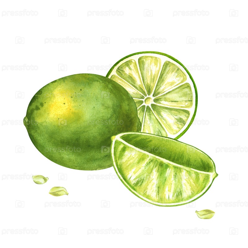 Свежая акварельная композиция цитрусовых фруктов целый зеленый лайм, сочный круглый кусок, четверть сегмента и разбросанные семена. Ручно нарисованная ботаническая иллюстрация с реалистичными текстурами и яркими цветами. Идеально подходит для рецептов мох