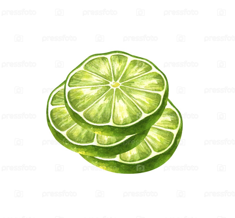 Несколько нарезанных кругов известняка наложены друг на друга. акварельная иллюстрация цитрусовых на изолированном фоне. реалистичный клипарт сочных фруктов для коктейлей