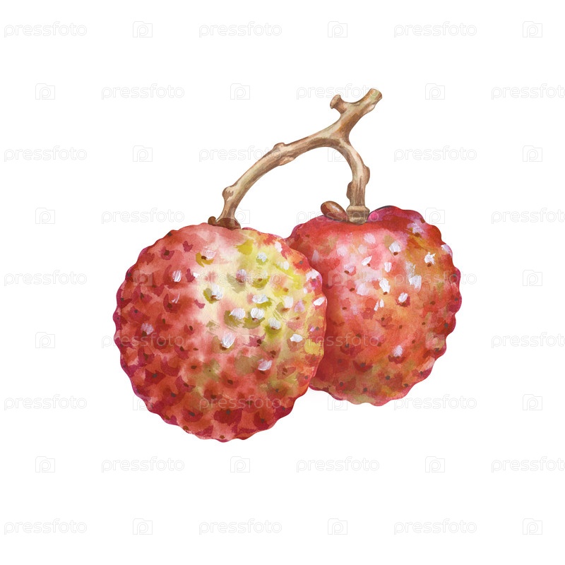 Два круглых фрукта личи на ветке нарисованы вручную.Акварельная иллюстрация с экзотическими азиатскими плодами на изолированном фоне.Реалистичный клипарт для дизайна продуктовых линий и коктейльных баров