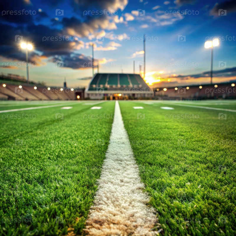 Вид вниз по центру футбольного поля на закате