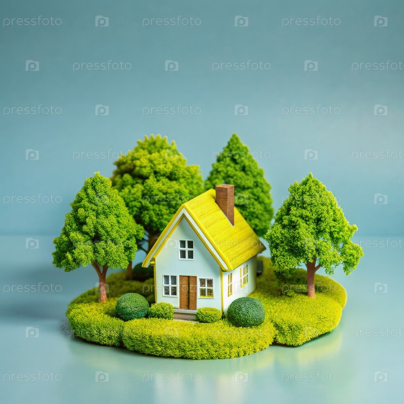 Миниатюрный Белый дом с желтой крышей, окруженный зелеными деревьями на синем фоне