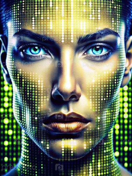 Близкий портрет женщины с лицом в цифровом матричном коде