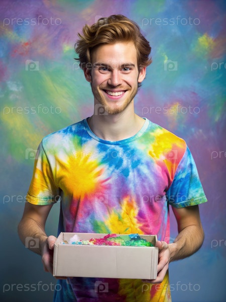 Молодой человек держит набор красочных красок для галстуков на цветном фоне
