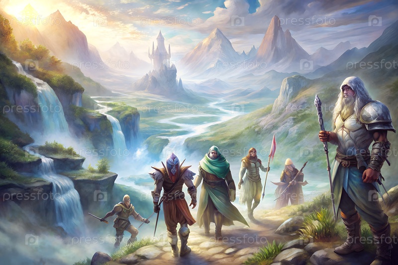 Группа фантастических приключенцев с видом на обширную горную долину и реку при восходе солнца, эпическое путешествие пейзажной сцены. g