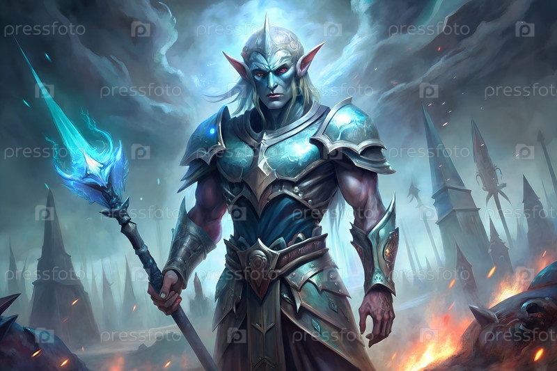 Эпический воин-темный эльф со светящимся волшебным посохом на мистическом поле битвы, кинематографический персонаж фантазии в доспехах. g