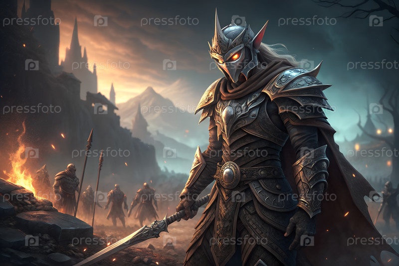 Эпический воин-темный эльф со светящимся волшебным посохом на мистическом поле битвы, кинематографический персонаж фантазии в доспехах. g