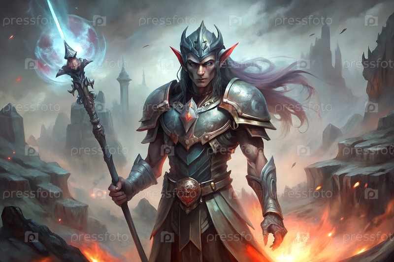 Эпический воин-темный эльф со светящимся волшебным посохом на мистическом поле битвы, кинематографический персонаж фантазии в доспехах. g