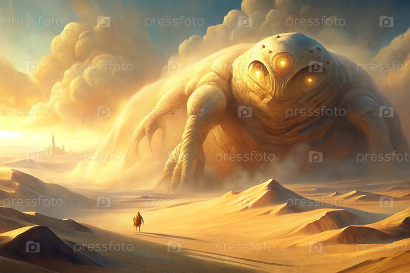 Эпическое гигантское пустынное существо, поднимающееся с песчаных дюн в то время как одинокий путешественник приближается к огромному кинематографическому ландшафту фантазии