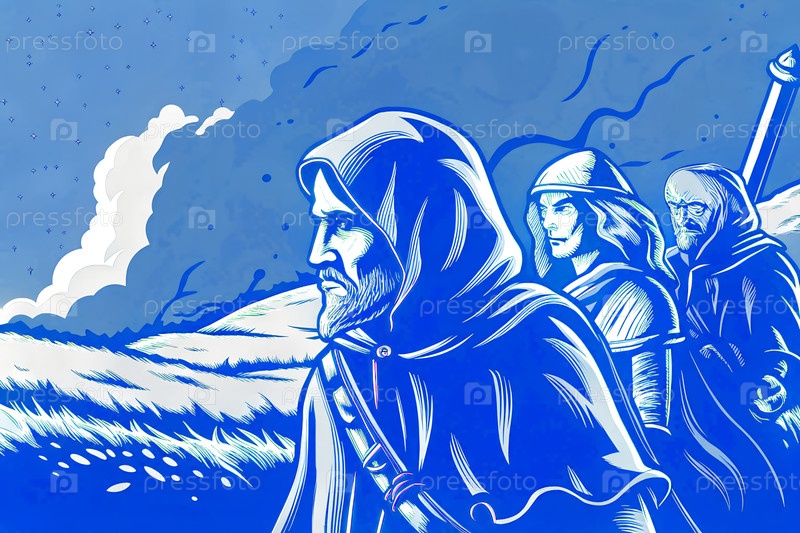 Группа фантастических приключенцев с видом на обширную горную долину и реку при восходе солнца, эпическое путешествие пейзажной сцены. g