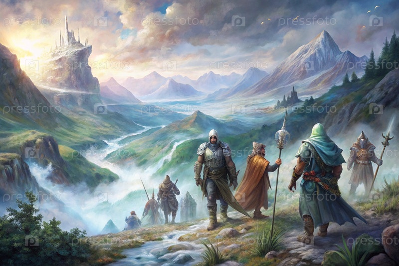 Группа фантастических приключенцев с видом на обширную горную долину и реку при восходе солнца, эпическое путешествие пейзажной сцены. g