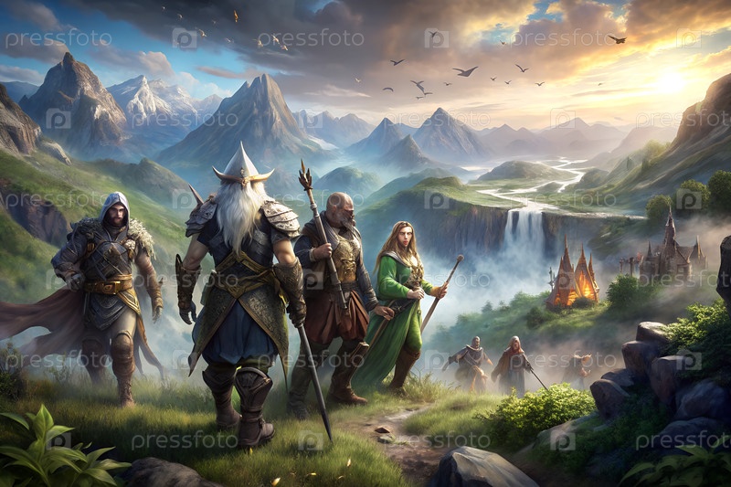 Группа фантастических приключенцев с видом на обширную горную долину и реку при восходе солнца, эпическое путешествие пейзажной сцены. g