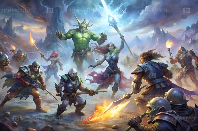 Эпическая фэнтези-сцена битвы с воинами, монстрами и молниеносом в драматическом горном пейзаже