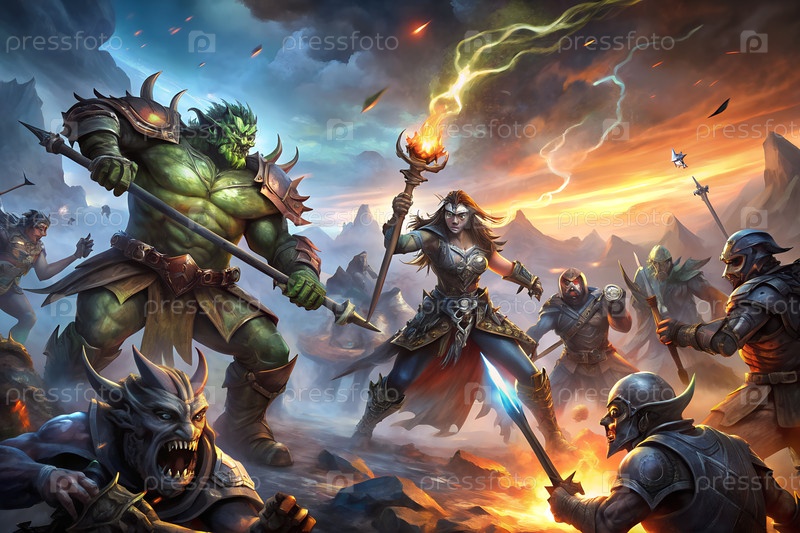 Эпическая фэнтези-сцена битвы с воинами, монстрами и молниеносом в драматическом горном пейзаже