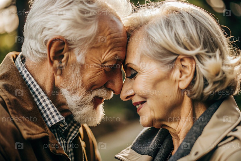 Любящая старшая пара, прикасающаяся к лбу и улыбаясь, близкий портрет пожилых партнеров, разделяющих нежный момент