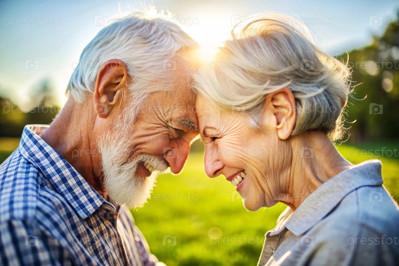 Любящая старшая пара, прикасающаяся к лбу и улыбаясь, близкий портрет пожилых партнеров, разделяющих нежный момент