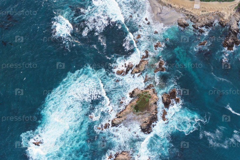 Вид с воздуха скалистой береговой линии с бирюзовыми волнами, разбивающимися вблизи Монтерея Калифорния США