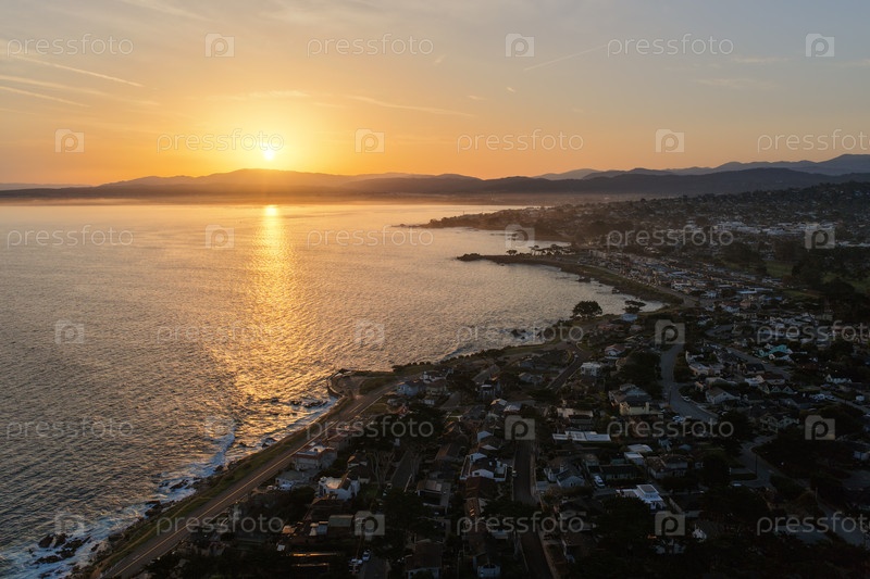 Воздушный восход солнца над береговой линией залива Монтереи с полем для гольфа, океанскими волнами и живописным ландшафтом Калифорнии