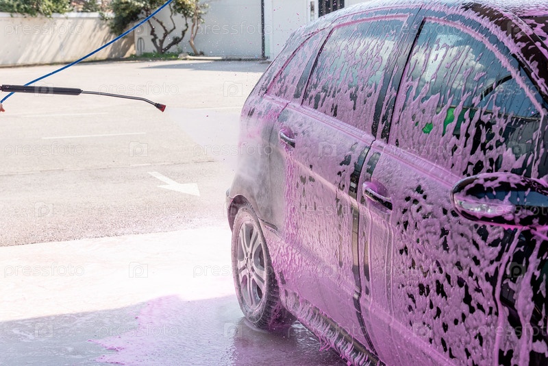 Водитель, применяющий розовую пену к черному мужчине автомытье на автомойке для ухода за транспортным средством