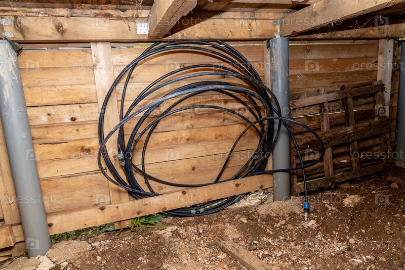 Тонкие водопроводные трубы, свернутые в катушку и хранящиеся в подвале кладовой жилого деревянного дома