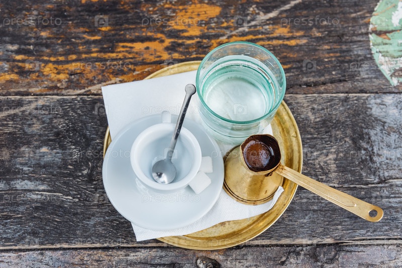 Традиционная культура Турецкий эспрессо-кофе, завариваемый в цезе на песке, подается в маленькой кружке из сладостей с близкого расстояния