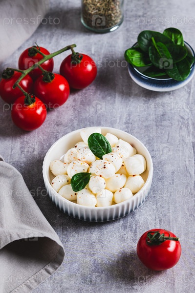 Чаша шариков моцареллы и шпината на столе вертикальный вид