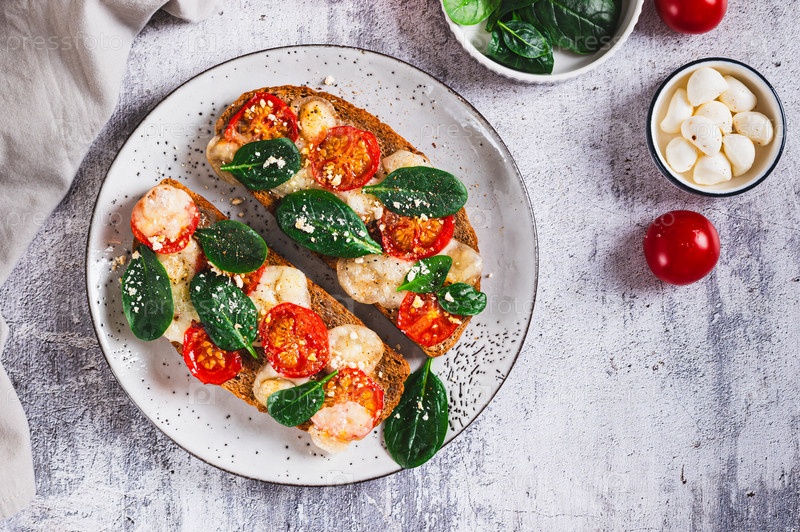 Выпеченные бутерброды с моцареллой, помидорами и шпинатом на тарелке