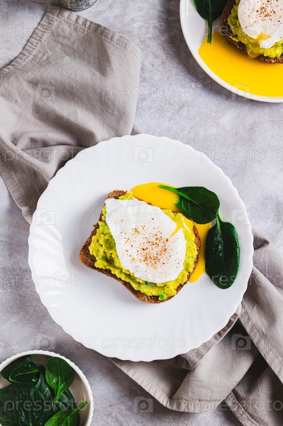 Сэндвич с авокадо с яичницей и шпинатом на тарелке, вертикальный вид