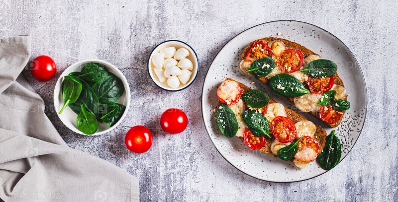 Выпеченная брушетта с салатами капрезе и шпинатом на тарелке на столе верхний вид веб-баннер
