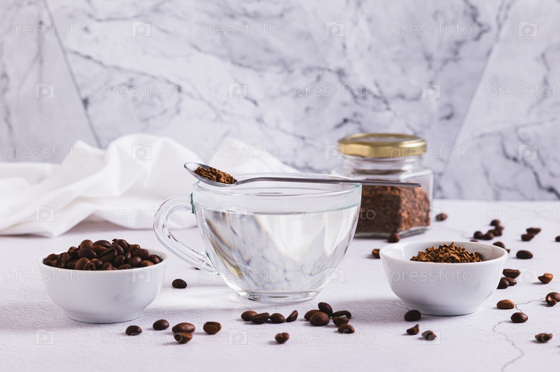 Чашка воды, гранулы мгновенного кофе и кофейные бобы на столе
