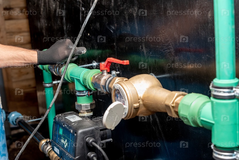 Человек-ремонтник устанавливает трубы и оборудование в насосном доме хранилище деревянного здания в подвале