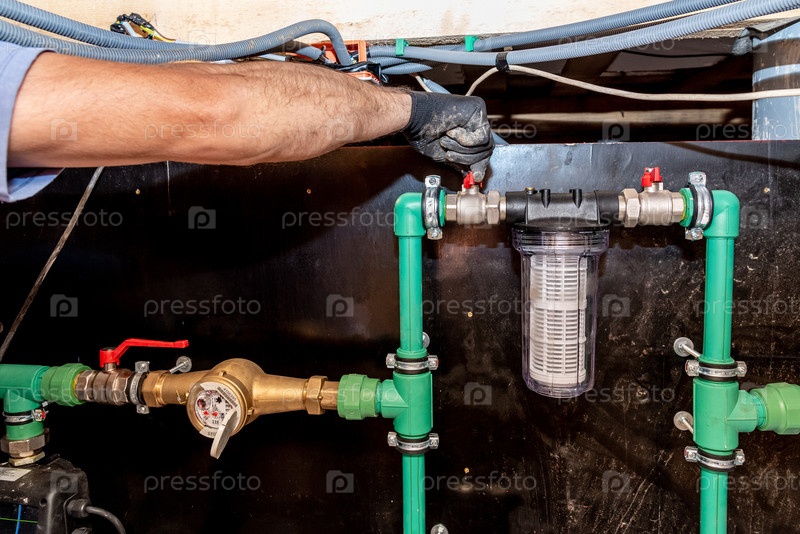Человек-ремонтник устанавливает трубы и оборудование в насосном доме хранилище деревянного здания в подвале