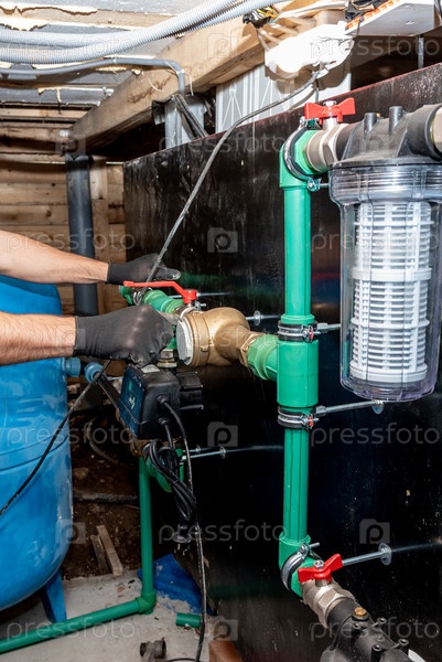 Человек-ремонтник устанавливает трубы и оборудование в насосном доме хранилище деревянного здания в подвале